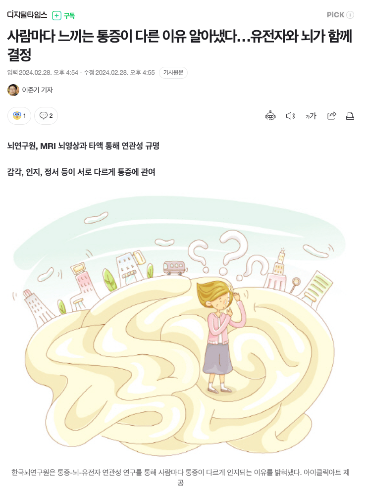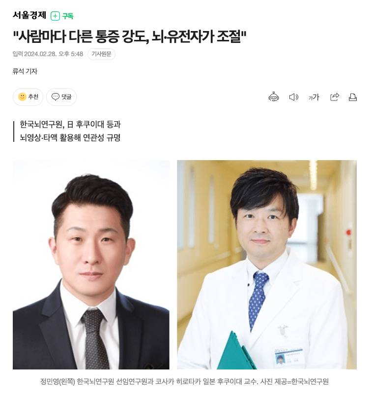 BDIL 연구성과 (통증-유전자)언론에 소개되었습니다 글쓴이Minyoung Jung2024-02-252024-03-04게시됨:세미나 2024.02.25 BDIL 정용전 박사님의 논문 성과가 언론보도되었습니다 [서울경제, 매일신문, 매일경제, 전자신문, 뉴스1, 동아사이언스, 지디넷코리아, 경북신문, 대구신문, 메디컬투데이, 헬스조선] 共有: 클릭하여 X에서 공유 (새 창에서 열림) X 페이스북에 공유하려면 클릭하세요. (새 창에서 열림) Facebook 좋아하기 가져오는 중...