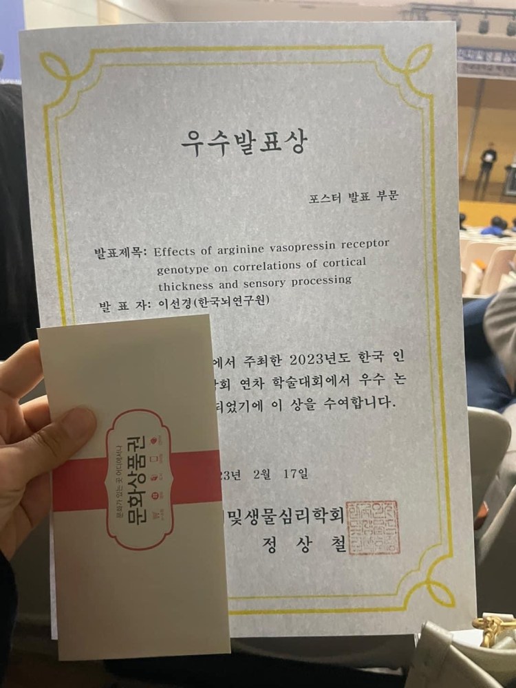 - 이선경 박사님 인지및생물심리학회 우수 발표상 수상